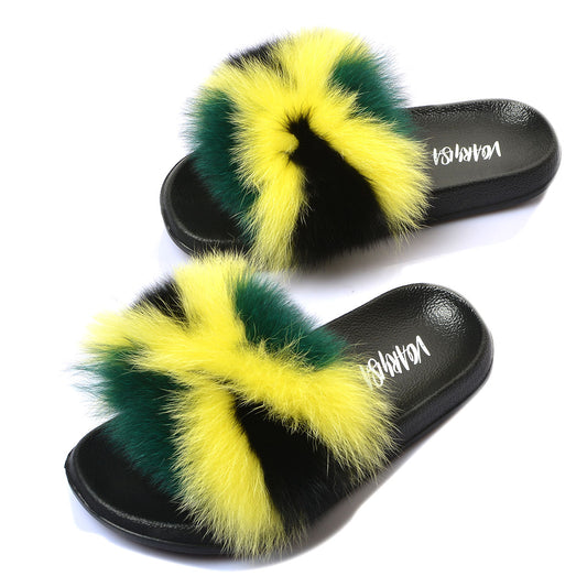 Women Fur Slippers Slides Open Toe Real Fox Fur Slippers Girls Fluffy Slip Jamaica Flag Rasta Caribbean